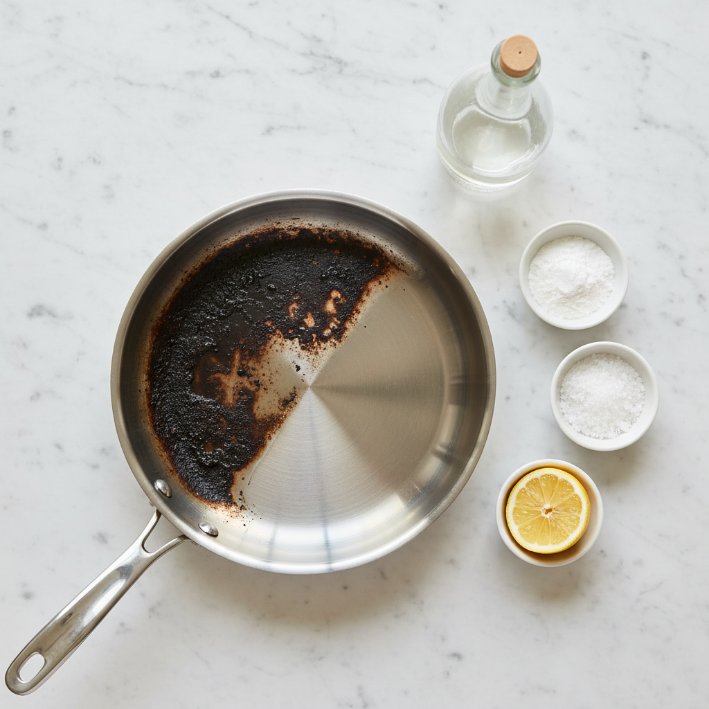 Heb je geen baking soda of azijn in huis? Geen probleem. Grof zout werkt als een mild schuurmiddel, terwijl het zuur van een citroen helpt om de verbrande koolstof af te breken.